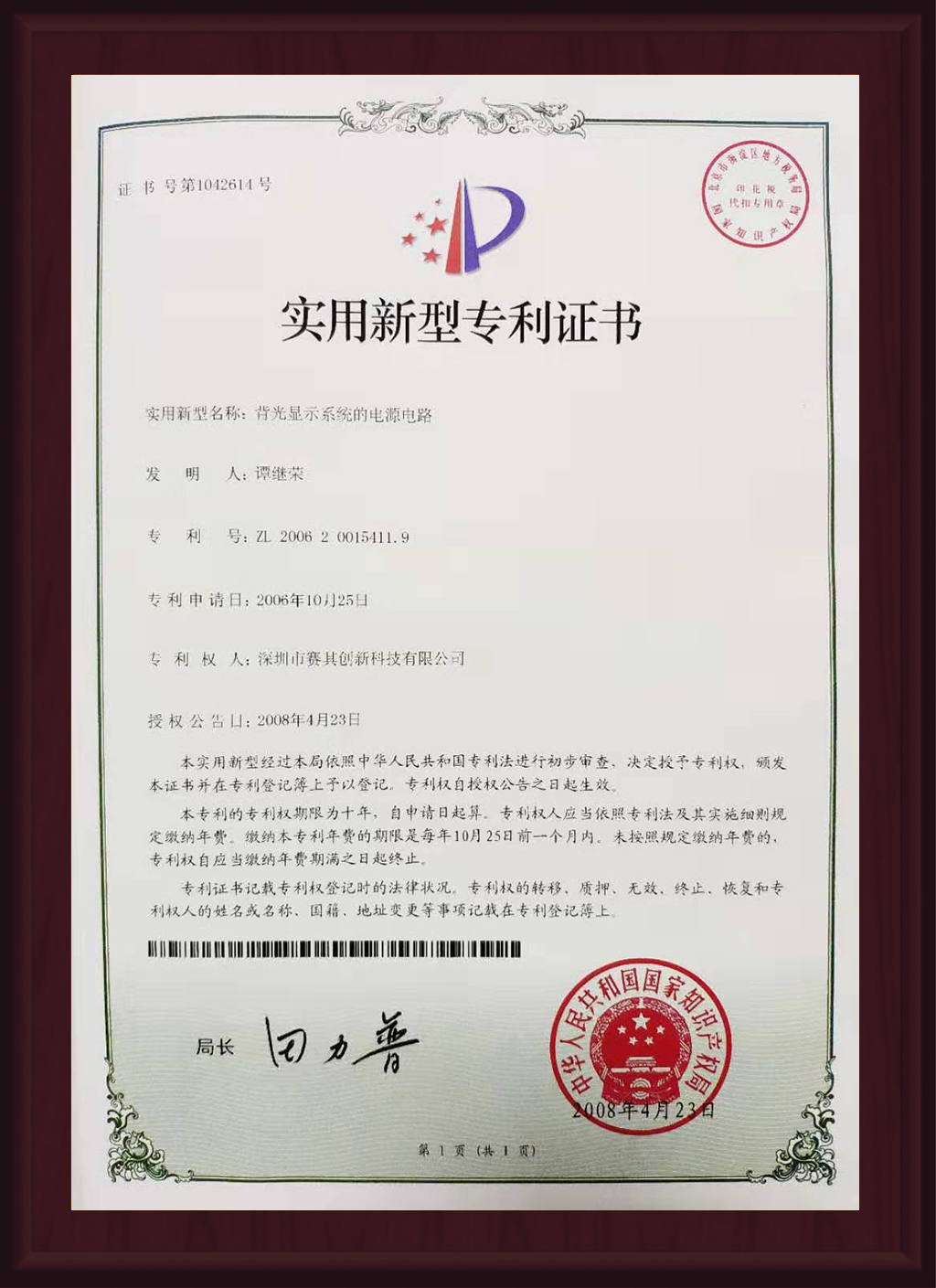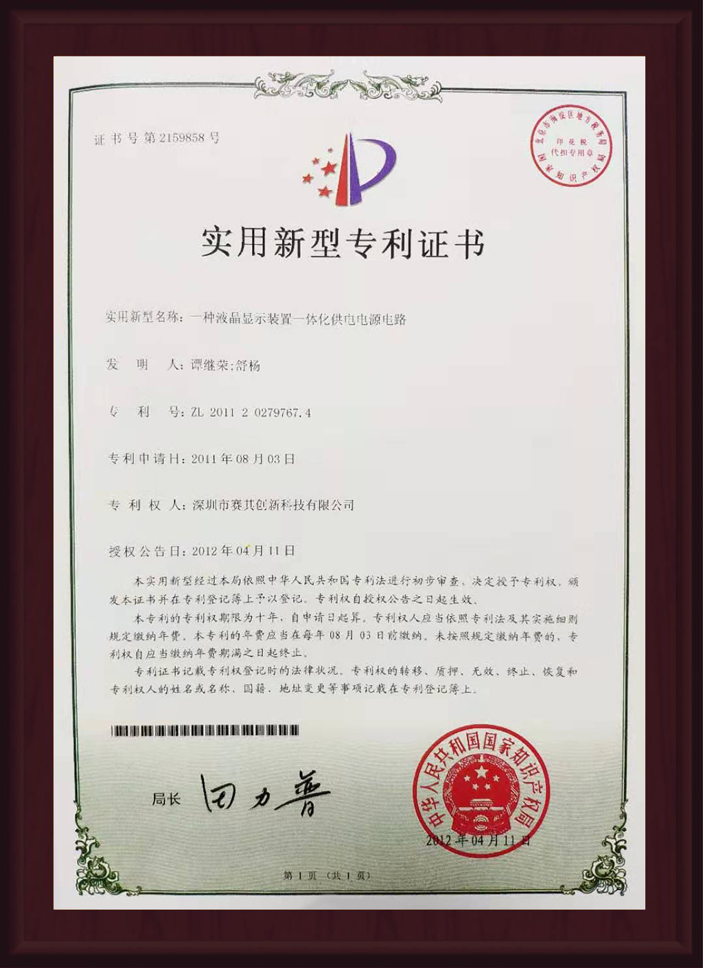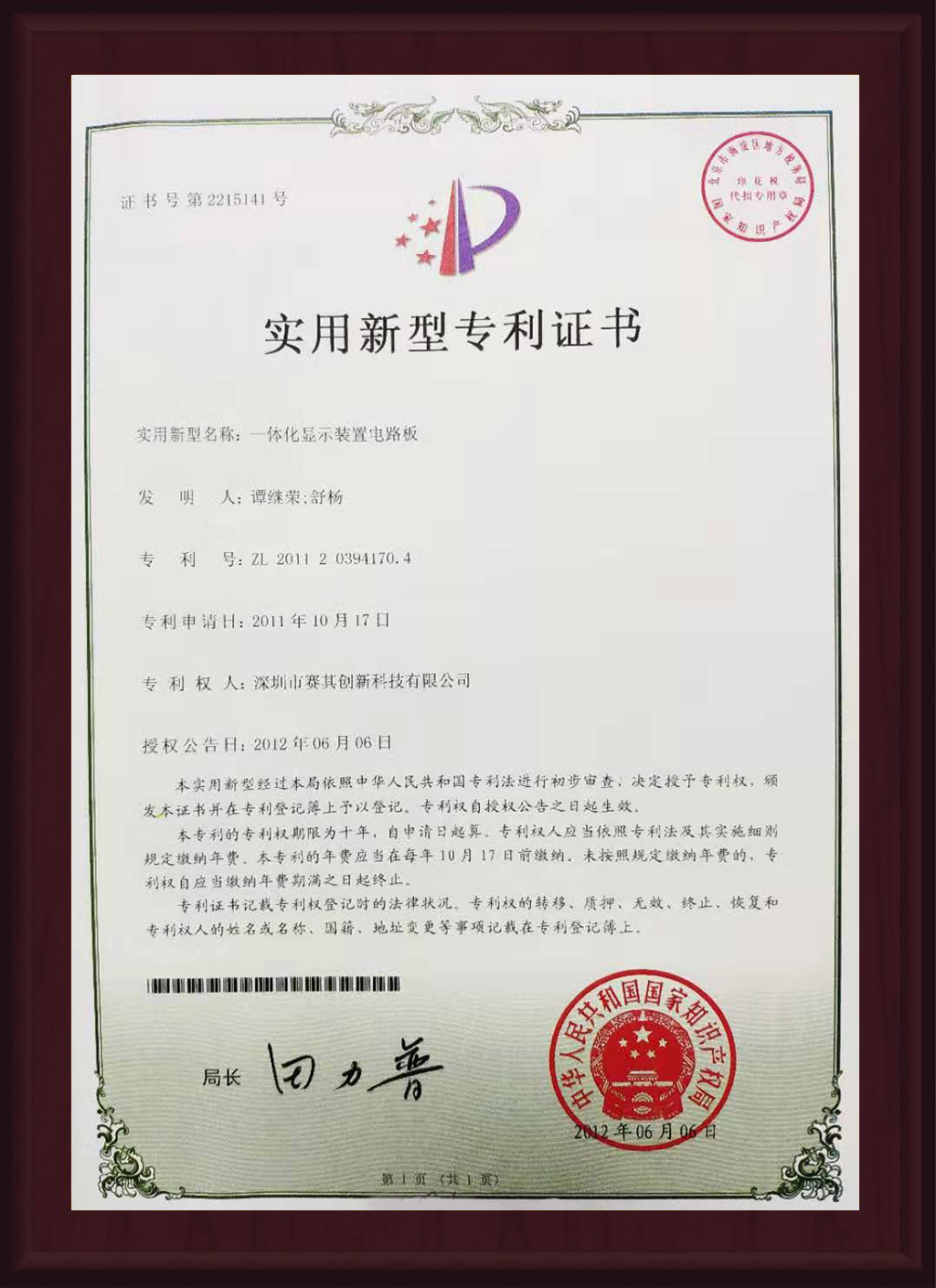 实用新型专利证书